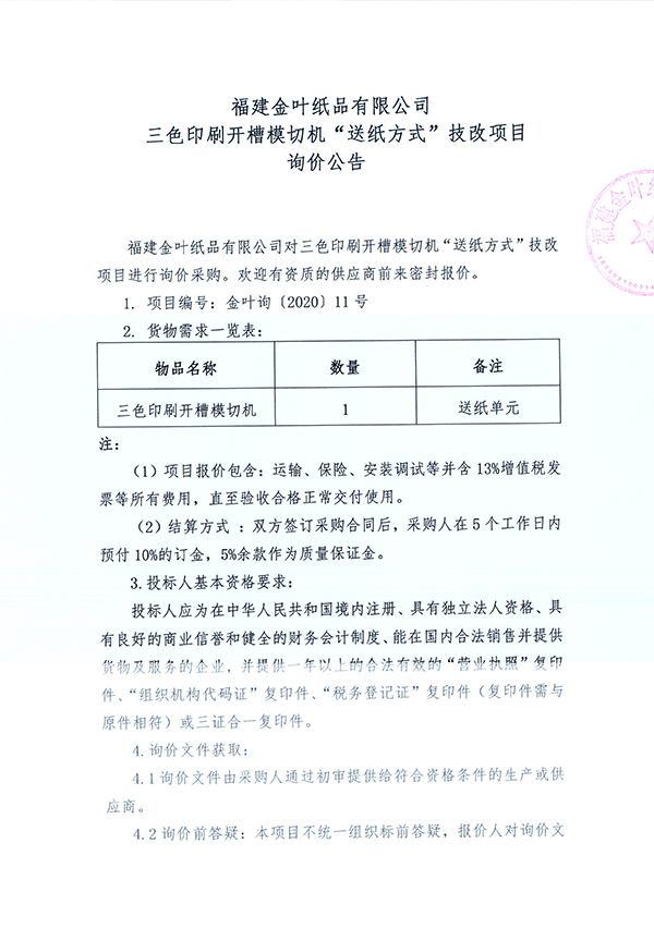 三色印刷開槽模切機(jī)“送紙方式”技改項(xiàng)目詢價公告