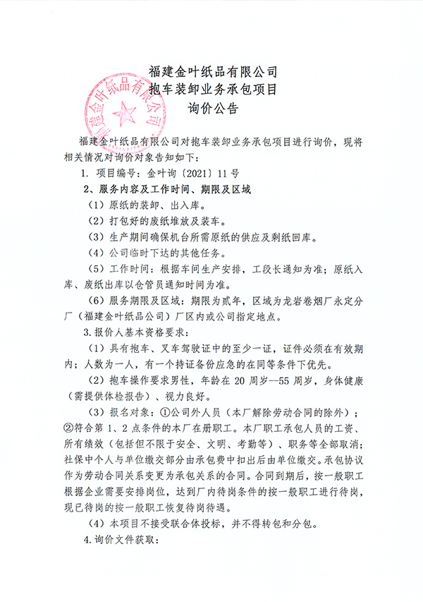 金葉紙品公司抱車裝卸業務承包項目詢價公告