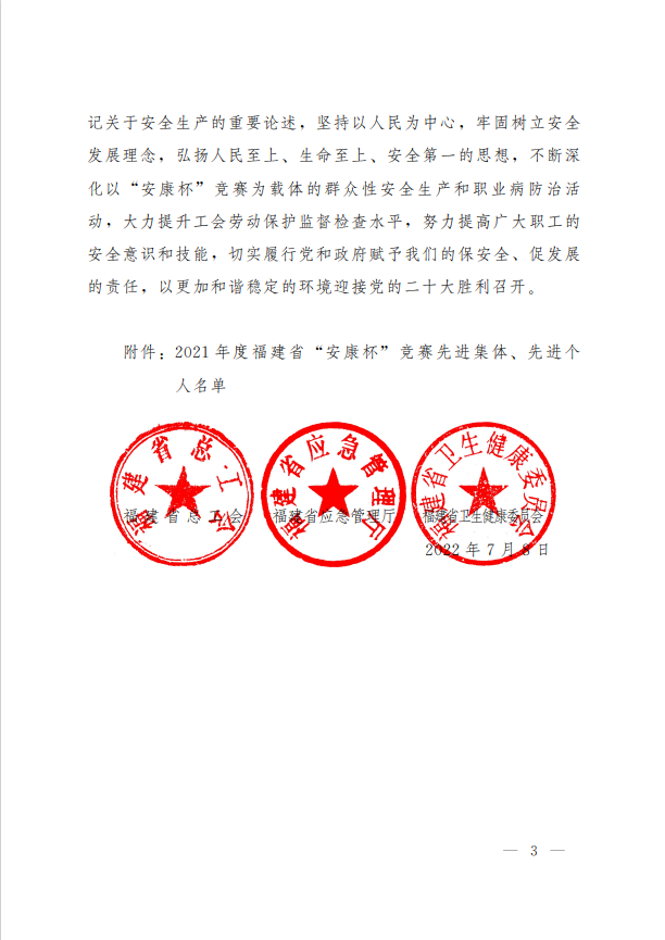近日,福建省總工會、福建省應急管理廳、福建省衛生健康委員會聯合發布《關于2021年度福建省“安康杯”競賽先進集體和個人的通報》,龍巖卷煙廠永定分廠榮獲2021年度福建省“安康杯”競賽先進集體榮譽稱號。