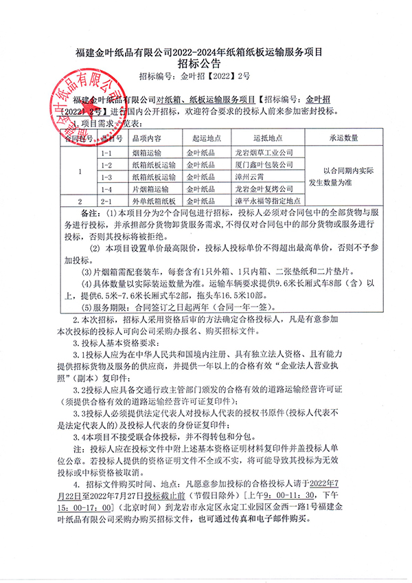 2022-2024年紙箱紙板運輸服務項目招標公告(二次招標)