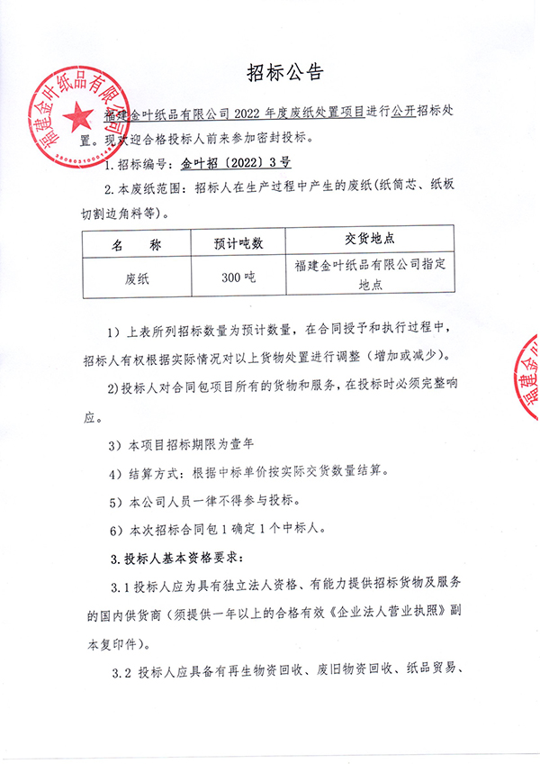 福建金葉紙品有限公司2022年度廢紙處置項目招標公告