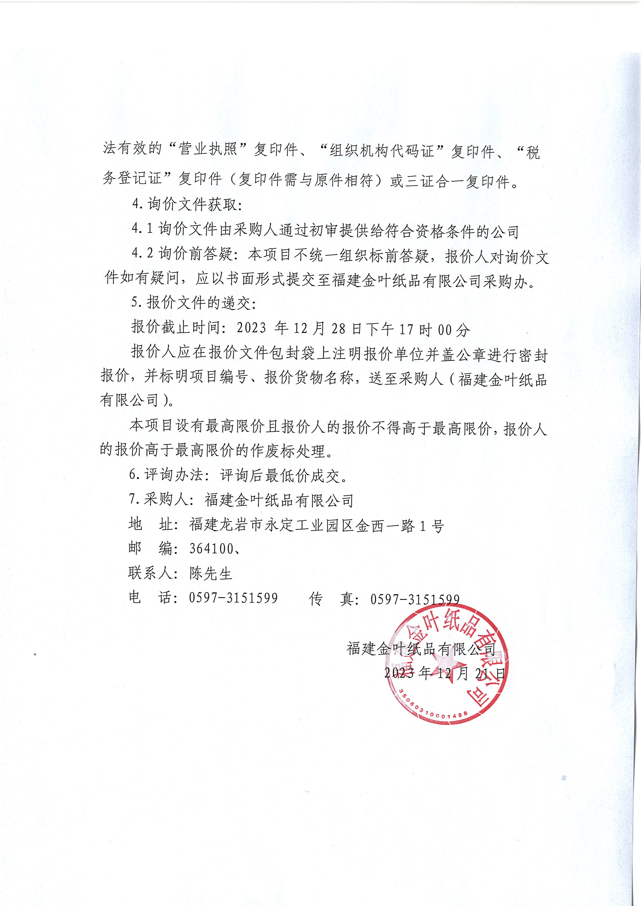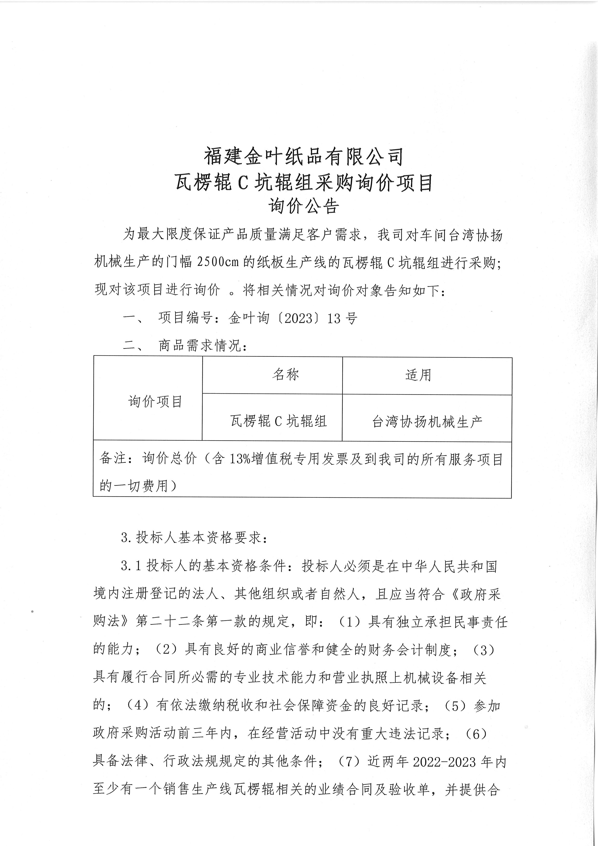 福建金葉紙品有限公司瓦楞輥C坑輥組采購詢價項目