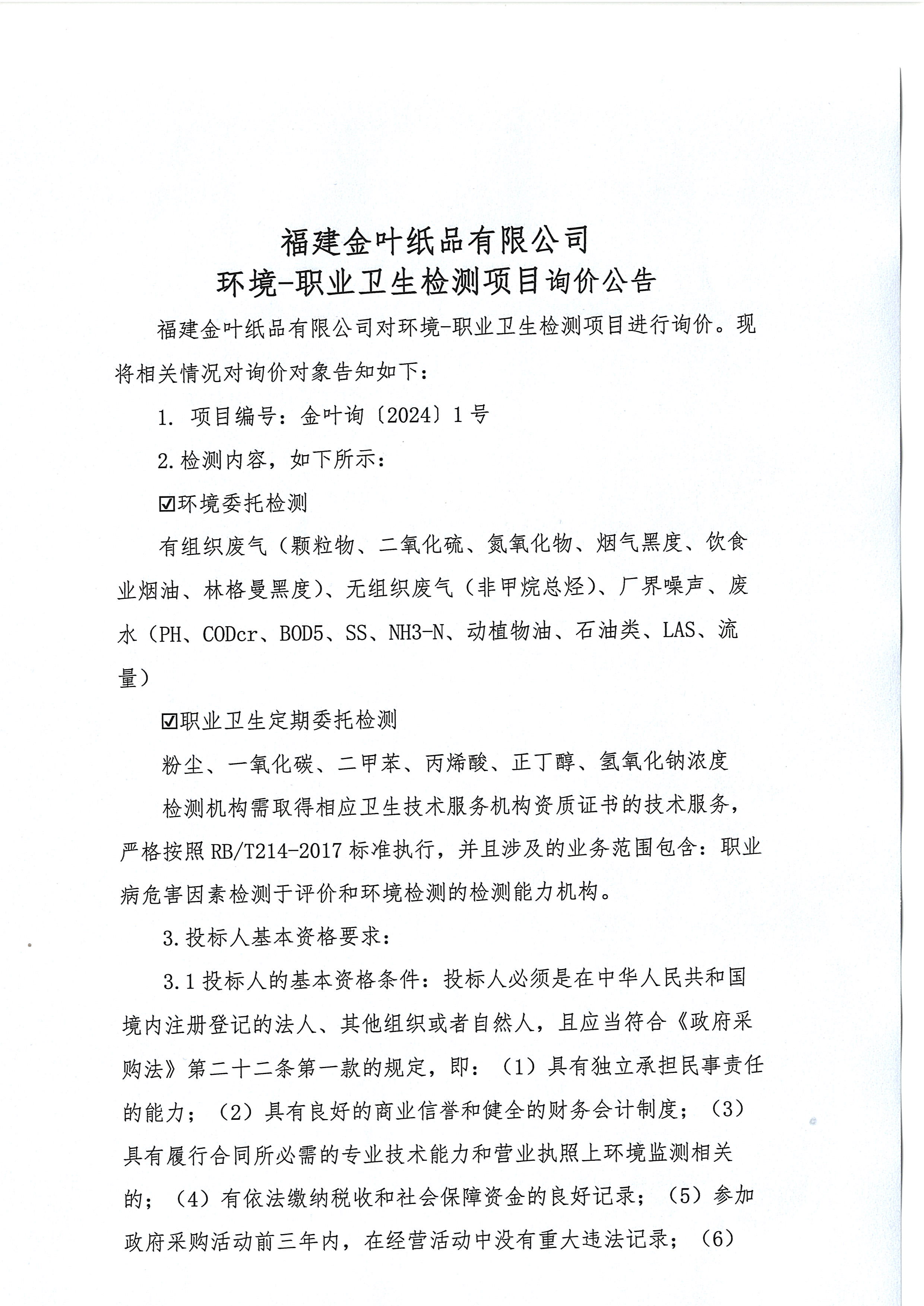 福建金葉紙品有限公司環境-職業衛生檢測項目